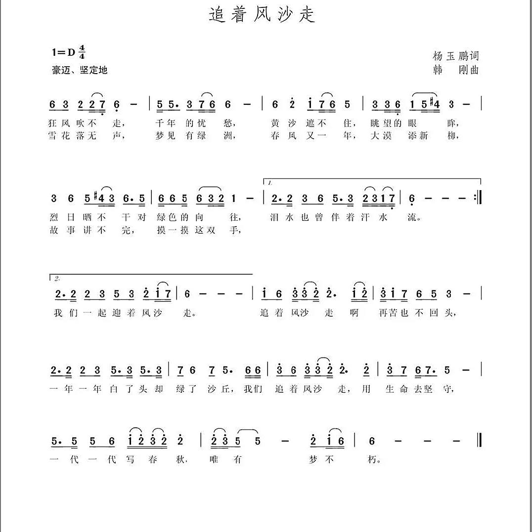 (一)《追著風(fēng)沙走》:作詞,楊玉鵬,青年詞作家,甘肅武威人。代表作品:《甘肅老家》(印青曲)、《土豆花兒開(kāi)》(韓剛曲)等。